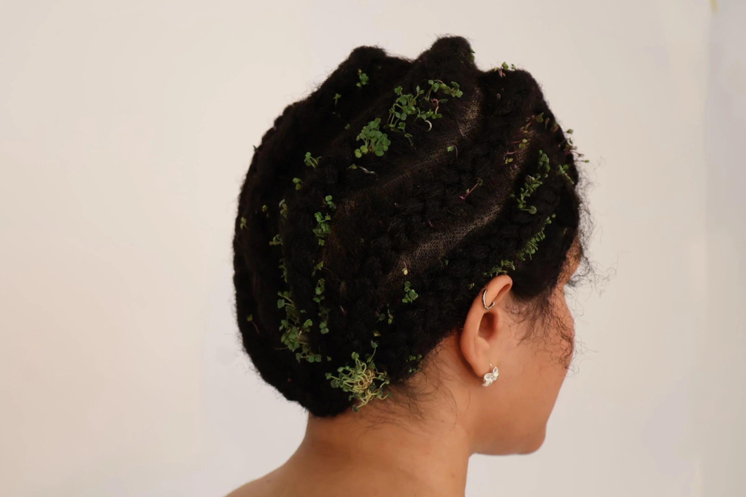 An ode to enslaved ancestors who braided seeds into their hair as an act of survival and self-determination. Inspired by Living Loom, Garden Rows explores hair as a site of cultivation. Microgreen seeds—chia, purple cabbage, mustard, arugula, and kohlrabi—are encapsulated in a sodium alginate biofilm, then embedded within braided hair to sprout.