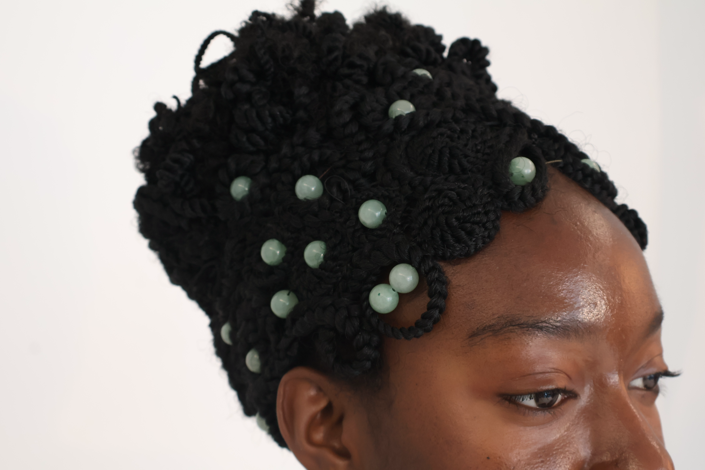 Shape memory alloy coils and green aventurine beads work together to activate acupressure points at the temples, apex, and base of the skull offering compression, cooling, and energetic support. Braids and beads form the structure, concealing an embedded system that sends programmed, rhythmic electrical signals to trigger compression within the coils. Inspired by Knitdema, the piece merges ancestral styling with therapeutic technology.