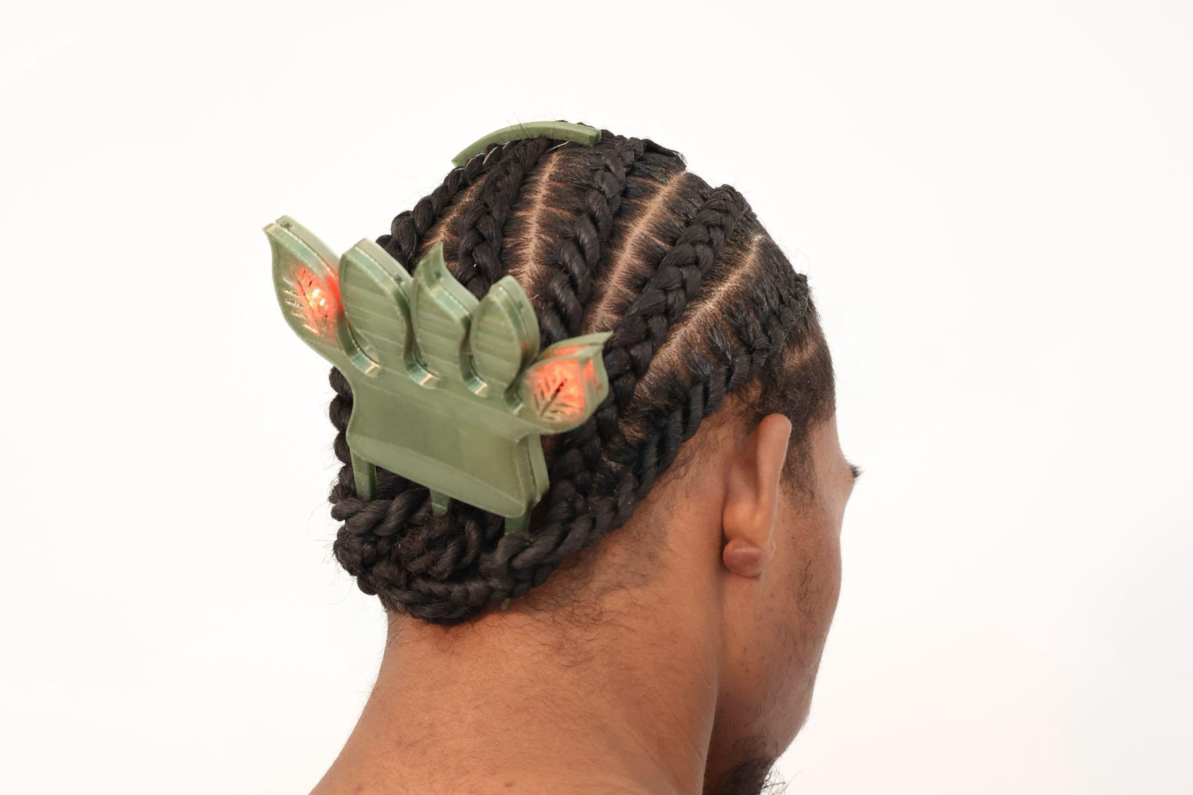 At the core of the work is a reimagined hair pick, inspired by the African Plai Na, a wooden comb traditionally used to create clean parts for braiding. Here, that cultural form becomes both housing and interface as the embedded microcontroller translates moisture data into a color-coded LED signal, indicating levels of dryness in real time.