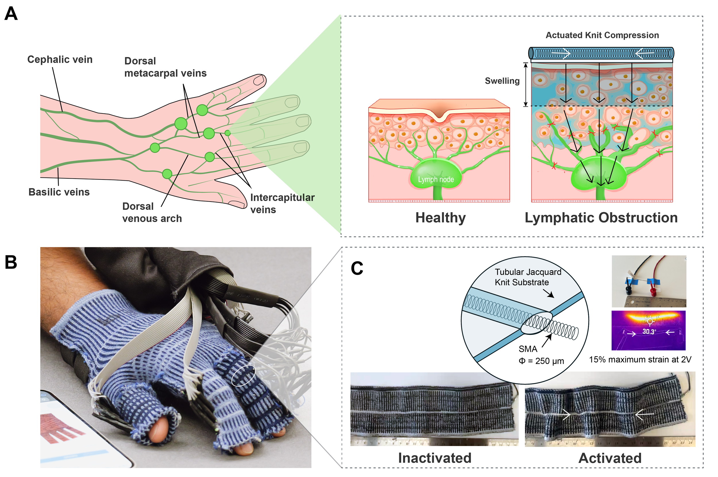 EdemaFlex consists of machine-knitted semi-glove and hardware to compress edematous hands sequentially. The device covers the whole hand and uses embedded shape memory alloy (SMA) bands to mobilize edema fluid from the fingertip to the base. (Photo: Hybrid Body Lab)